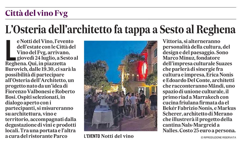 In occasione dell’evento Le Notti del Vino che si terrà il 24 luglio a Sesto al Reghena, NODE Architetti avrà l’occasione di raccontare MĀNDI, uno spazio di unione culturale, il primo riad a Marrakech che fonde la tradizione friulana con quella marocchina.